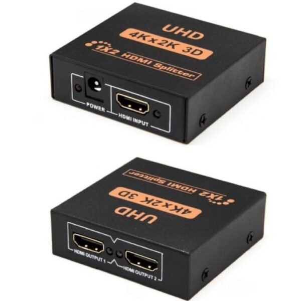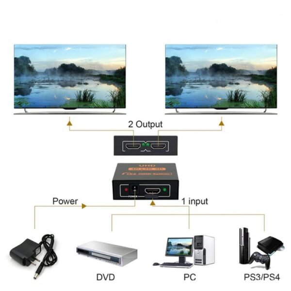 – Distribución 1×2 (Duplicado/Espejo): Cuenta con 1 puerto de Entrada HDMI (Input) donde conectas tu dispositivo fuente (consola de videojuegos, PC, Laptop, Decodificador, etc.).