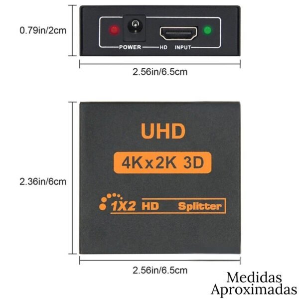 – Puertos: 1 Entrada HDMI Hembra (Input) / 2 Salidas HDMI hembra (Output 1 y 2).