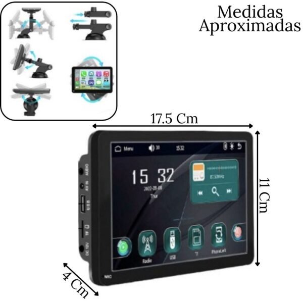 – Audio Versátil: Cuenta con audio integrado (altavoces propios). Además, puedes enviar el sonido a los parlantes de tu auto mediante el cable Auxiliar.