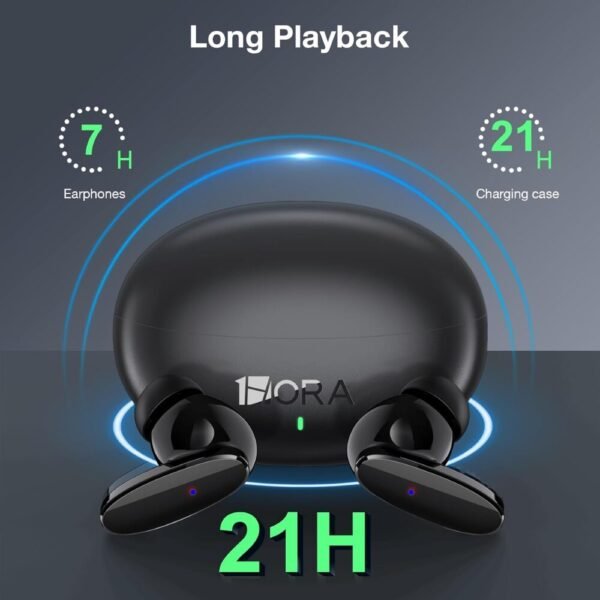 – Larga vida útil de la batería: Estos auriculares proporcionan un tiempo de reproducción de 7 horas cuando se cargan, un total de 21 horas de la Caja de carga y una capacidad de reproducción del 100%. La Caja de carga se carga rápidamente a través del cable USB c.