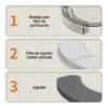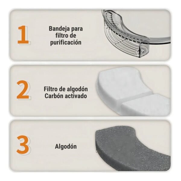– El filtro es reemplazable y consiste en una capa de algodón, carbón activado y resina de intercambio iónico para proporcionar agua limpia a su mascota durante todo el día.