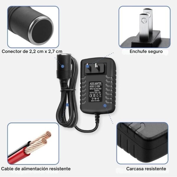 – Salida (Output): DC 12V ⎓ 2A.