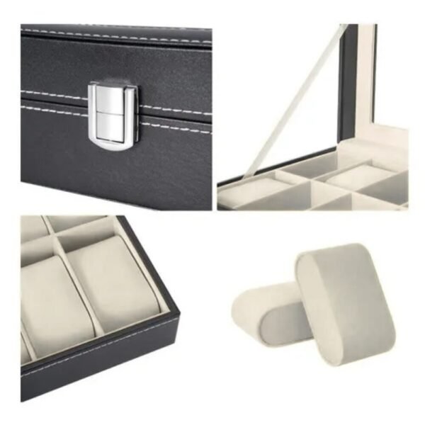 Organiza y protege tu colección con esta caja para relojes de diseño clásico y sofisticado, ideal para uso personal o comercial. Su acabado negro, combinado con materiales de alta calidad, ofrece un aspecto limpio, moderno y atemporal.