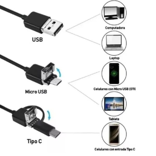 Gracias a su compatibilidad con smartphones y tablets Android, puedes conectar la cámara directamente a tu dispositivo de manera alámbrica por conexión USB, permitiéndote ver las imágenes en tiempo real en la pantalla de tu dispositivo móvil. La cámara ofrece una alta resolución y nitidez, garantizando una visualización precisa de los detalles durante la inspección.