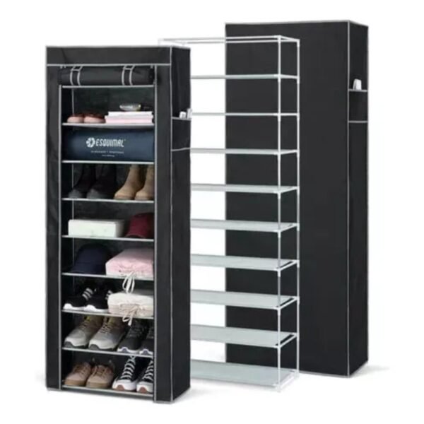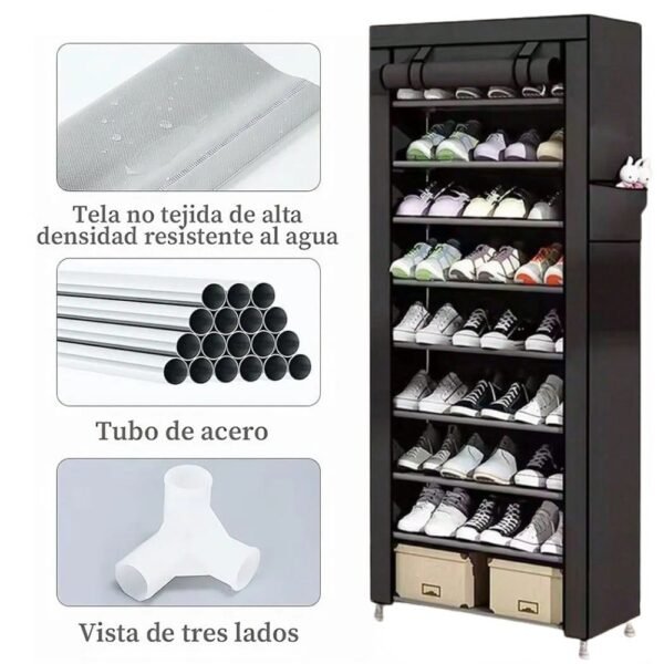 – Amplia Capacidad de Almacenamiento: Cuenta con 10 niveles (filas) que te ofrecen un espacio generoso para guardar una gran cantidad de pares de zapatos, así como ropa.