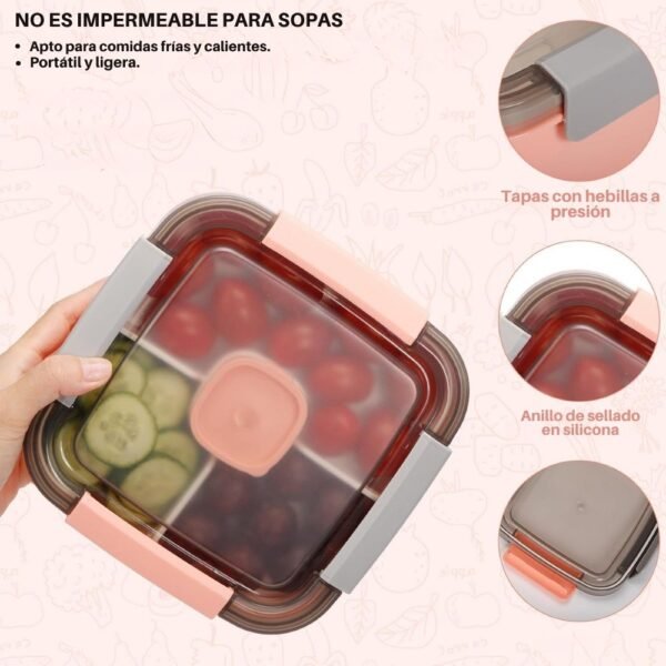 Nota Importante: Aunque cuenta con un sello de silicona de alta calidad para mantener la frescura de tus alimentos y evitar escapes de salsas espesas, NO es impermeable para líquidos abundantes como sopas o caldos. Su diseño está optimizado para almuerzos sólidos, ensaladas y guarniciones.
