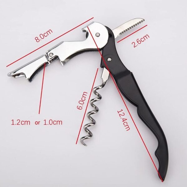 3. Corta cápsulas (Pequeña Navaja): Incluye una pequeña hoja serrada plegable en el extremo opuesto. Esta navaja está diseñada específicamente para cortar de forma limpia y segura el papel de aluminio o la cápsula que recubre el cuello de las botellas de vino antes de descorcharlas.