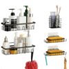 – Set Completo de 5 Piezas: A diferencia de otros organizadores simples, este kit equipa tu baño por completo. Incluye estantes de gran capacidad para botellas altas (shampoo, acondicionador), jaboneras dedicadas y un soporte exclusivo para cepillos de dientes y pasta dental.