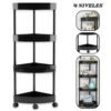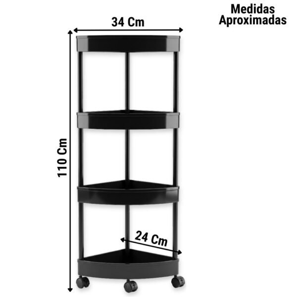 – Diseño de 4 Niveles: Ofrece cuatro bandejas espaciosas con bordes altos para evitar que los objetos se caigan. Es ideal para almacenar botellas de shampoo, toallas, detergentes e incluso recipientes o palanganas en la base.