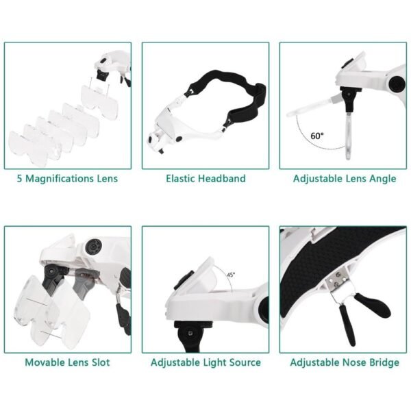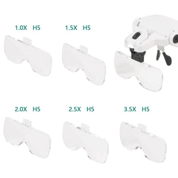 – 5 Lentes de Aumento Intercambiables: Este kit incluye cinco lentes acrílicos de grado óptico con diferentes niveles de aumento: 1.0X, 1.5X, 2.0X, 2.5X y 3.5X. Cuentan con dureza H5, lo que los hace altamente resistentes y garantizan una visión nítida.