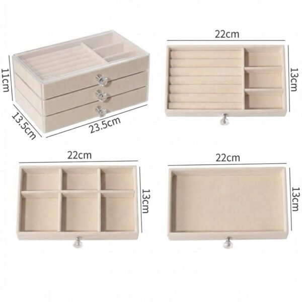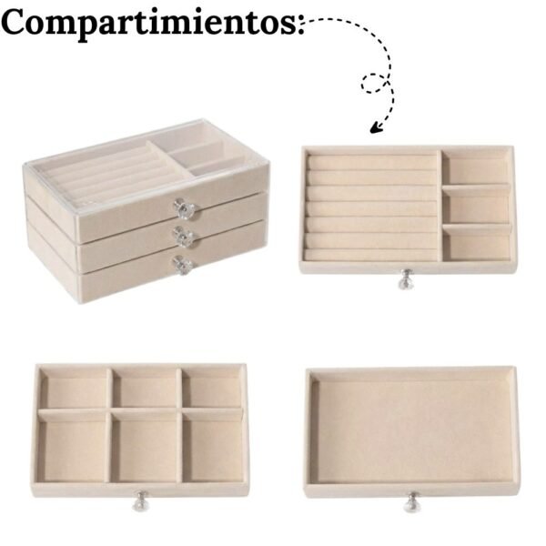 – Diseño Inteligente de 3 Niveles: Cuenta con tres cajones extraíbles diseñados para diferentes tipos de joyas:
