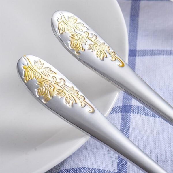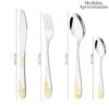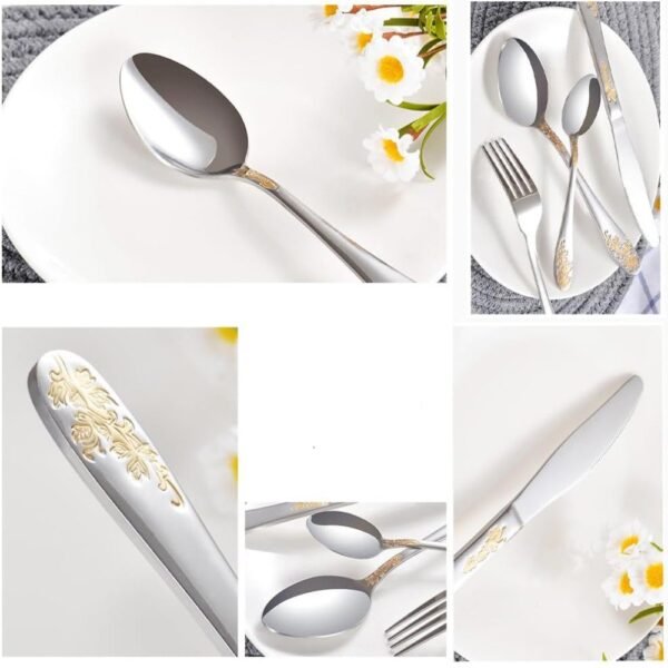 – Cubiertos Elegantes y Duraderos: Fabricado con acero inoxidable de alta calidad, este juego es resistente al calor y a la deformación, garantizando que no se doblará ni romperá con el uso. Su sólida construcción asegura una larga durabilidad.