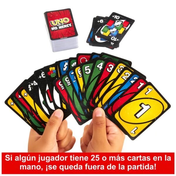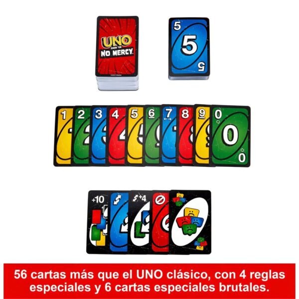 ¡El UNO más brutal, despiadado y sin remordimientos que hayas jugado! Si pensabas que un «+4» rompía amistades, espera a ver lo que hace el UNO No Mercy. Esta edición especial lleva la competencia al siguiente nivel con castigos mucho más severos y reglas nuevas diseñadas para hacer el juego más caótico y divertido.