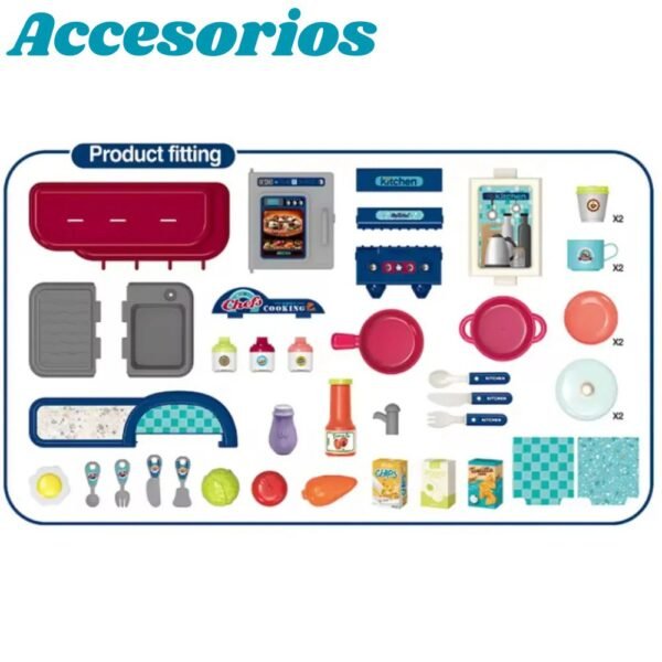 – Gran Variedad de Accesorios: Viene equipada con ollas, sartenes, tapas, cubiertos, platos, vasos y una selección de alimentos de juguete para que el menú nunca sea aburrido.