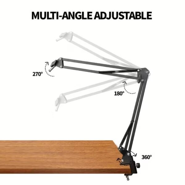 – Brazo Articulado Multiposición: Cuenta con un soporte metálico tipo tijera con prensa ajustable para fijarlo al borde de tu escritorio. Es totalmente maleable a tu postura gracias a su rotación de 360° en la base, y ajustes de 180° y 270° en sus articulaciones.
