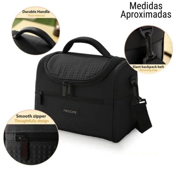 Olvídate de las bolsas de almuerzo aburridas y pequeñas. La Lonchera Térmica Frische combina un diseño sofisticado con una funcionalidad superior. Con una capacidad generosa de 8 litros, es perfecta para llevar el menú completo de tu día (desayuno, almuerzo y snacks) manteniendo todo a la temperatura ideal, ya sea caliente o frío, gracias a su recubrimiento interior.