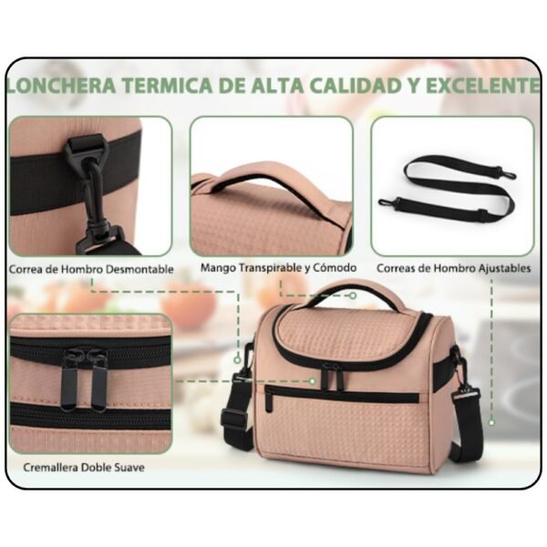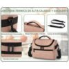 – Aislamiento Térmico Eficiente: Su interior está forrado con material de aluminio térmico de alta calidad, diseñado para conservar la temperatura de tus alimentos por más tiempo y siendo muy fácil de limpiar en caso de derrames.