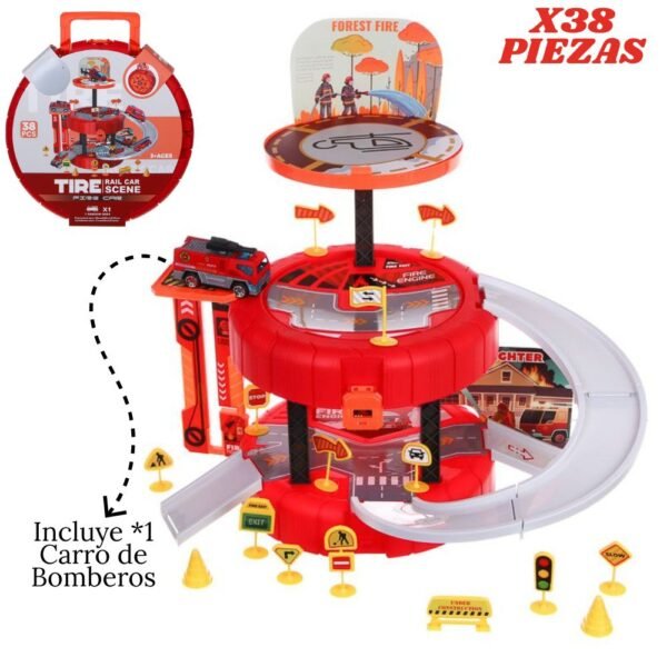 – Cantidad de piezas: 38 unidades (incluye maleta, tramos de pista, señales, 1 vehículo de bombero y stickers decorativos).