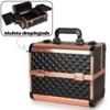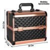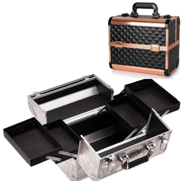 Presentamos el Neceser-Cosmetiquera de Maquillaje definitivo, el organizador de 4 Bandejas plegables en un impresionante acabado Oro Rosa Diamante, diseñado para el estilista moderno y la fashionista que exige lo mejor.