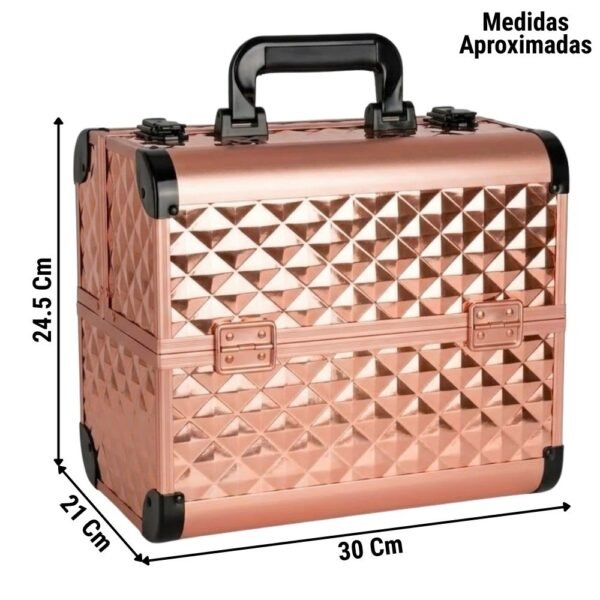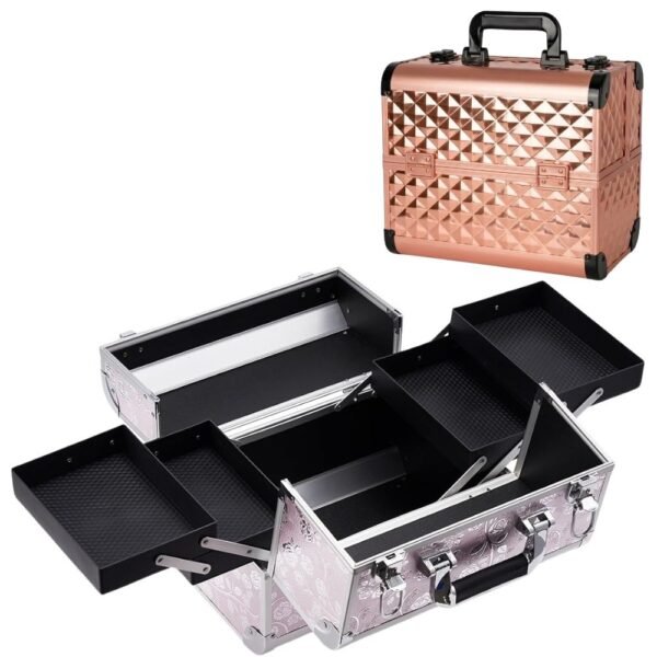 Presentamos el Neceser-Cosmetiquera de Maquillaje definitivo, el organizador de 4 Bandejas plegables en un impresionante acabado Oro Rosa Diamante, diseñado para el estilista moderno y la fashionista que exige lo mejor.