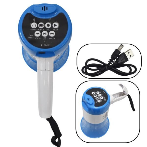 Dispositivo portátil diseñado para amplificar la voz y facilitar la comunicación en espacios amplios o ruidosos, ideal para su uso en eventos, manifestaciones, actividades al aire libre, deportes, y situaciones de emergencia. Este megáfono es recargable, lo que significa que no necesita baterías desechables, lo que lo hace más económico y ecológico.
