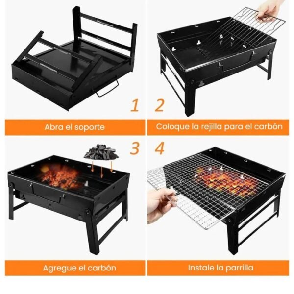 – Olvídate de manuales complicados o tornillos perdidos. Estará lista para usar en 4 sencillos pasos: Despliega las patas (que también sirven como soporte firme), Coloca la rejilla inferior para el carbón, Agrega tu carbón favorito y enciéndelo, Instala la parrilla superior… ¡y a cocinar!