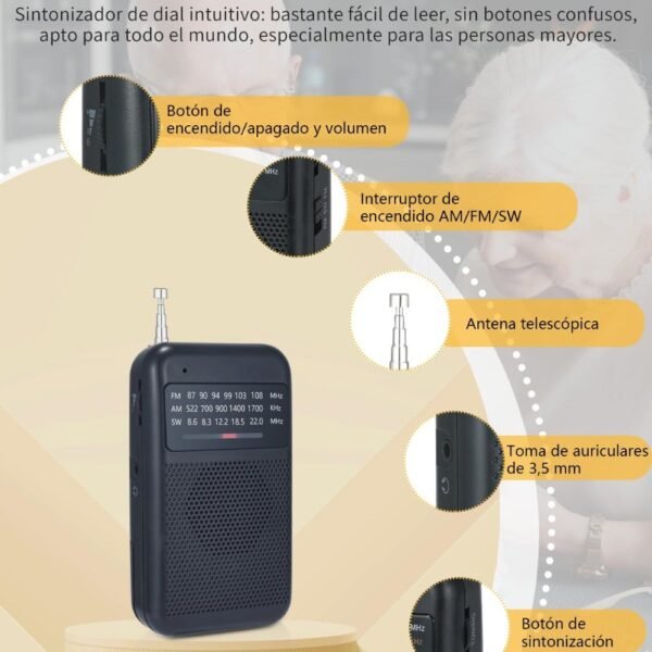 – Bandas AM/FM/SW: Sintoniza fácilmente una amplia variedad de estaciones locales con su dial analógico de alta precisión.