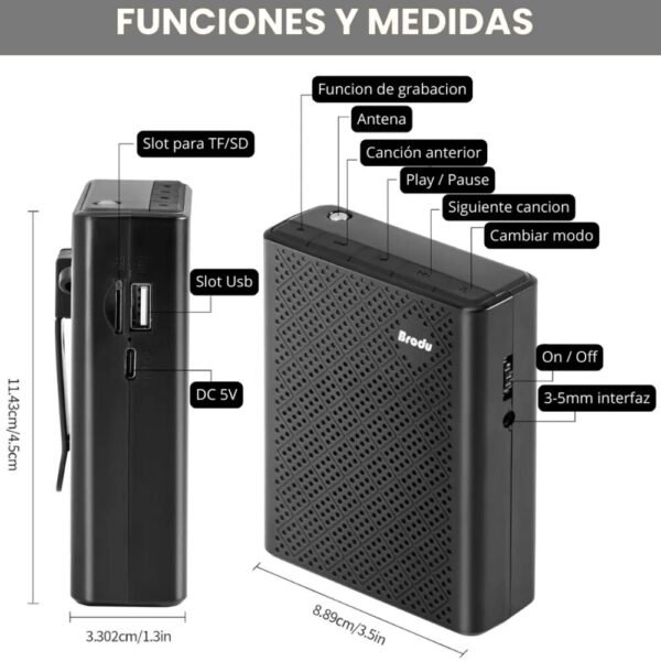 – Funciones: Amplificador de voz, Radio FM, Parlante Bluetooth.