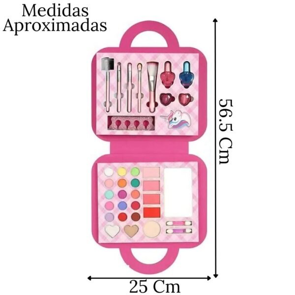 – Bandejas mostrando una increíble variedad de sombras,labiales y un set para decorar sus uñas. Es perfecto para tardes de juego con amigas, fiestas de pijamas o simplemente para divertirse en casa.
