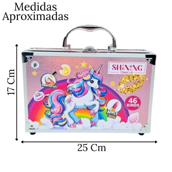 Deja volar la imaginación y creatividad de tu pequeña con el Set de Maquillaje Shining Makeup. Este no es solo un juguete, es una experiencia completa de belleza diseñada especialmente para niñas. Presentado en una hermosa maleta rígida con bordes metálicos y un diseño de unicornio de ensueño, este kit hará que se sienta como toda una profesional.