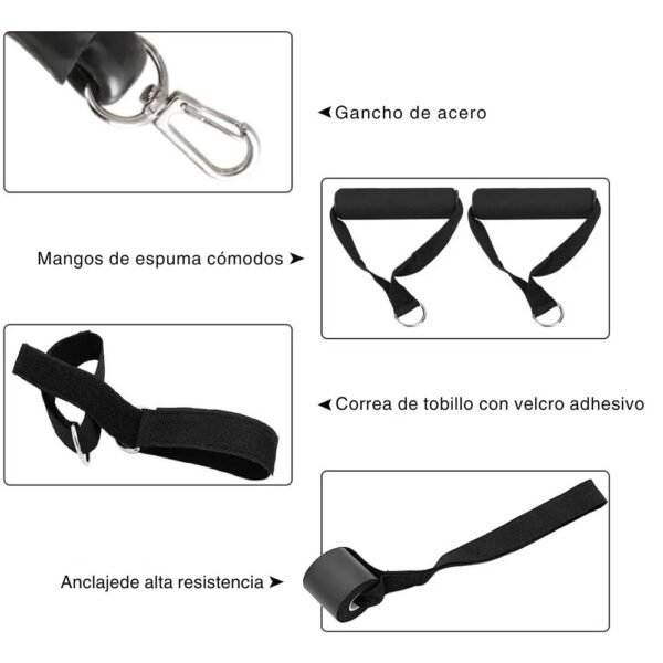 – Gimnasio Completo (11 Piezas): No necesitas nada más. El kit viene con 2 asas acolchadas (para proteger tus manos), 2 correas de tobillo (ideales para trabajo de glúteos y piernas), y 1 anclaje de puerta grueso para que puedas hacer ejercicios de pecho y espalda de forma segura en cualquier marco de puerta.