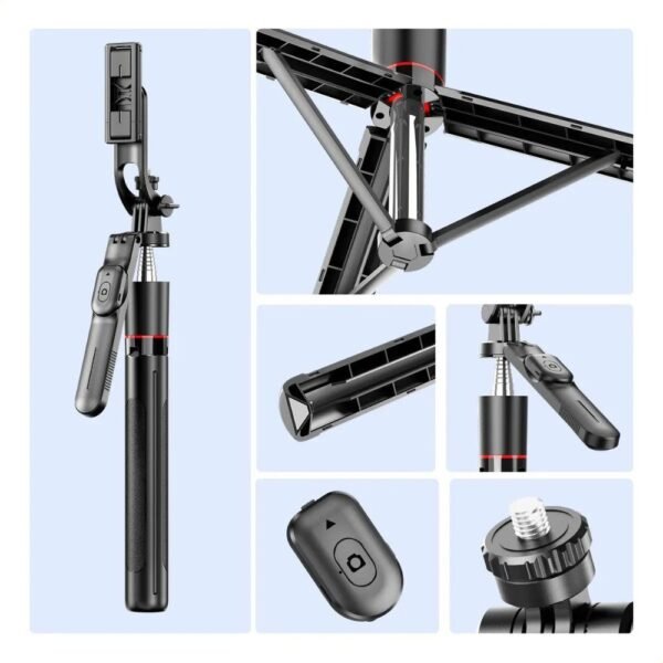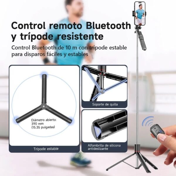 – Control Remoto Bluetooth: Incluye un pequeño disparador inalámbrico que se sincroniza rápidamente con tu celular (iOS o Android). Puedes alejarte del trípode, posar con calma y tomar la foto o iniciar la grabación de video con un solo clic.