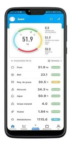 Podrás hacer seguimiento de tu peso y el de 7 usuarios más, con conexión bluetooth a smartphone para enlazar con la aplicación “TOKOK”, además de medir, permite conservar históricos de: Peso, Índice de masa corporal (IMC), Porcentaje de grasa corporal, Índice de masa muscular, Porcentaje de agua corporal, Grasa visceral, Densidad ósea, Tasa de metabolismo basal.