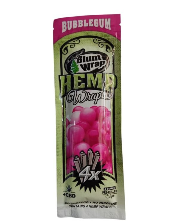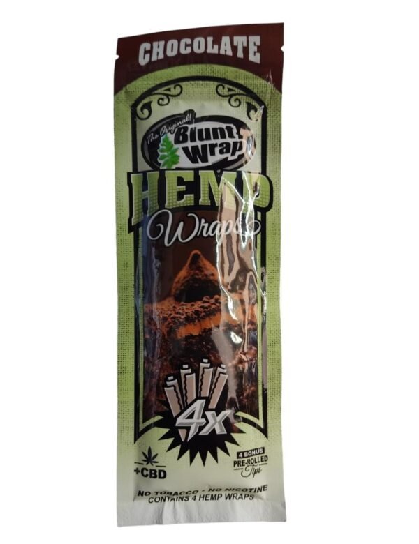 Blunt Wrap Hemp empacado al vacío y con paquete resellable, cuenta con 4 envoltorios para rolar, dispuestos en forma de espiral, hechos a base de HEMP(cáñamo), con CBD, completamente libres de tabaco y nicotina.