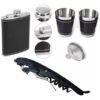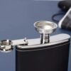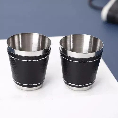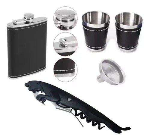 Material de Acero inoxidable, con capacidad de 8 oz, y sus copas metálicas tienen una capacidad aprox. de 30 ml cada uno. Presenta tapa con módulo de cierre seguro, garantizando sellado completo y sin fugas, atornillada que está unida, por lo que la tapa no se perderá. Su formato curvo ofrece comodidad cuando se coloca en el bolsillo de los pantalones.
