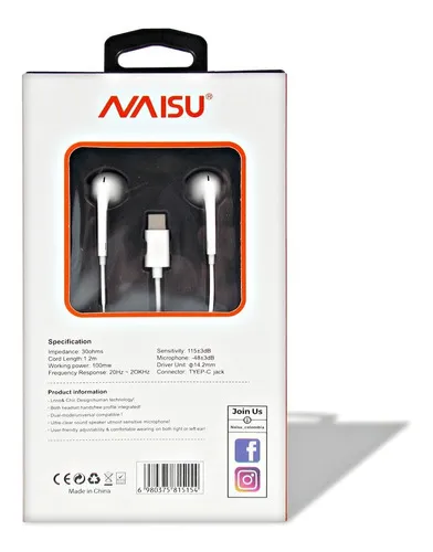 Intendencia 30 ohmios. Longitud del cable 1.2 m. Potencia de trabajo 100 Mw. Respuesta de frecuencia 20Hz-20khz. Sensibilidad 115+3db. Micrófono -48+3db. Unidad de controlador 14.2 mm. Conector tipo C. Ambos auriculares con perfil de manos libres integrados compatible con modo dual/ universal. Micrófono de máxima sensibilidad con Altavoz de sonido ultra claro. Ajuste fácil de usar y de uso cómodo.