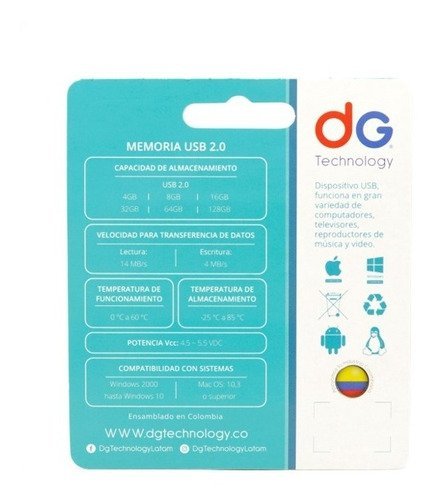 Memoria USB 2.0 32GB DG Technology Dispositivo USB de 32GB, funciona en gran variedad de computadores, televisores, reproductores de música y video. Tu información siempre a mano en cualquier momento y lugar, Velocidad de lectura de 14 MB/s y de escritura de 4 MB/s, temperatura de funcionamiento 0°C a 60°C, temperatura de almacenamiento -25°C a 85°C, Potencia Vcc: 4.5 – 5.5 VDC, Compatible con sistemas Windows 2000 hasta Windows 10, Mac OS: 10,3 o Superior. Dimensiones: 12x11x2 cm Peso: 15 g