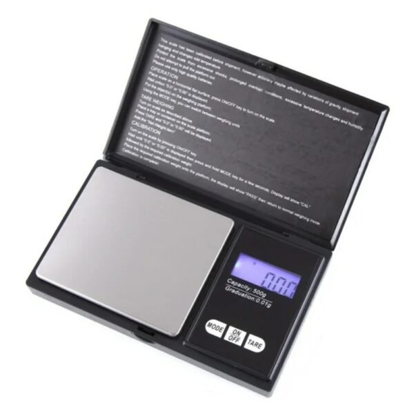 Diseño compacto con medición rápida y precisa. Tiene una precisión de 500 g/0,01 g, función de tara, es adecuado para muchas necesidades de pesaje (oro, plata, piedras preciosas, monedas, recarga, medicamentos, pasatiempos, etc.).
