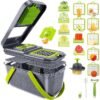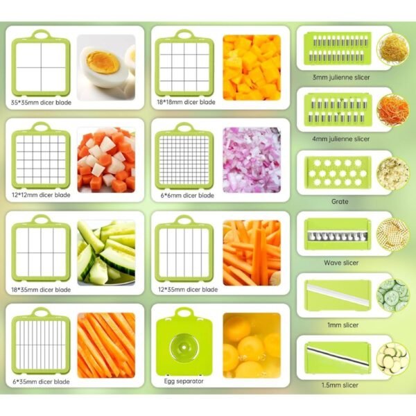 Funcionalidad versátil: el picador de verduras viene con variedad de tamaños de cuchillas de picar, 5 cuchillas intercambiables para cortar, rallar, juliana y separador de huevos, lo que te permite cortar varios alimentos en diferentes formas y grosores, satisfaciendo diversas necesidades de cocción.