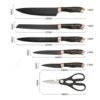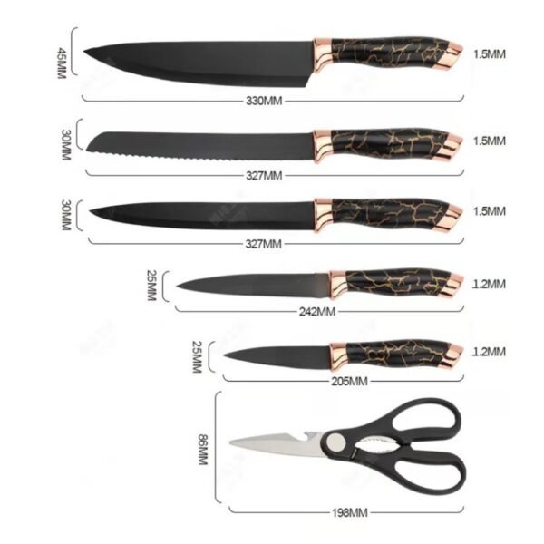 – Soporte para almacenamiento: El set viene con un soporte de almacenamiento que no solo organiza los cuchillos y la tijera de forma ordenada, sino que también los mantiene al alcance de la mano mientras cocinas.